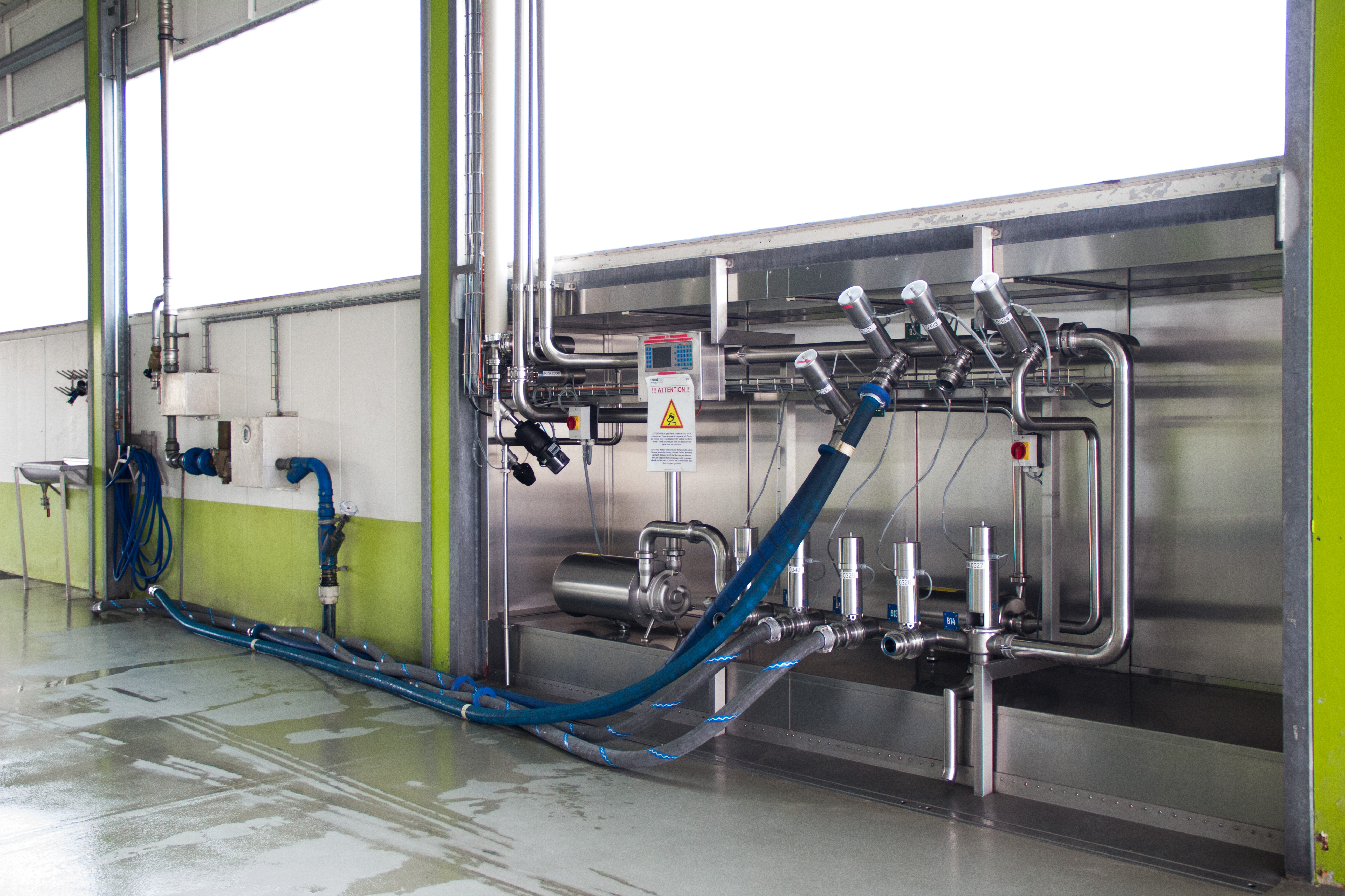 TRANSLAIT SA possède un CIP hautes performances qui accepte simultanément le lavage intérieur de 3 véhicules citernes, ceci jusqu'à une stérilisation par eau chaude. Implantée sur le site de production de Chésopelloz, l'installation est approvisionnée en eau chaude par une station solaire, laquelle fournit près de 20% de l'énergie annuelle nécessaire. Cette station est ouverte aux transporteurs externes et dispose également d'une tête de lavage.
