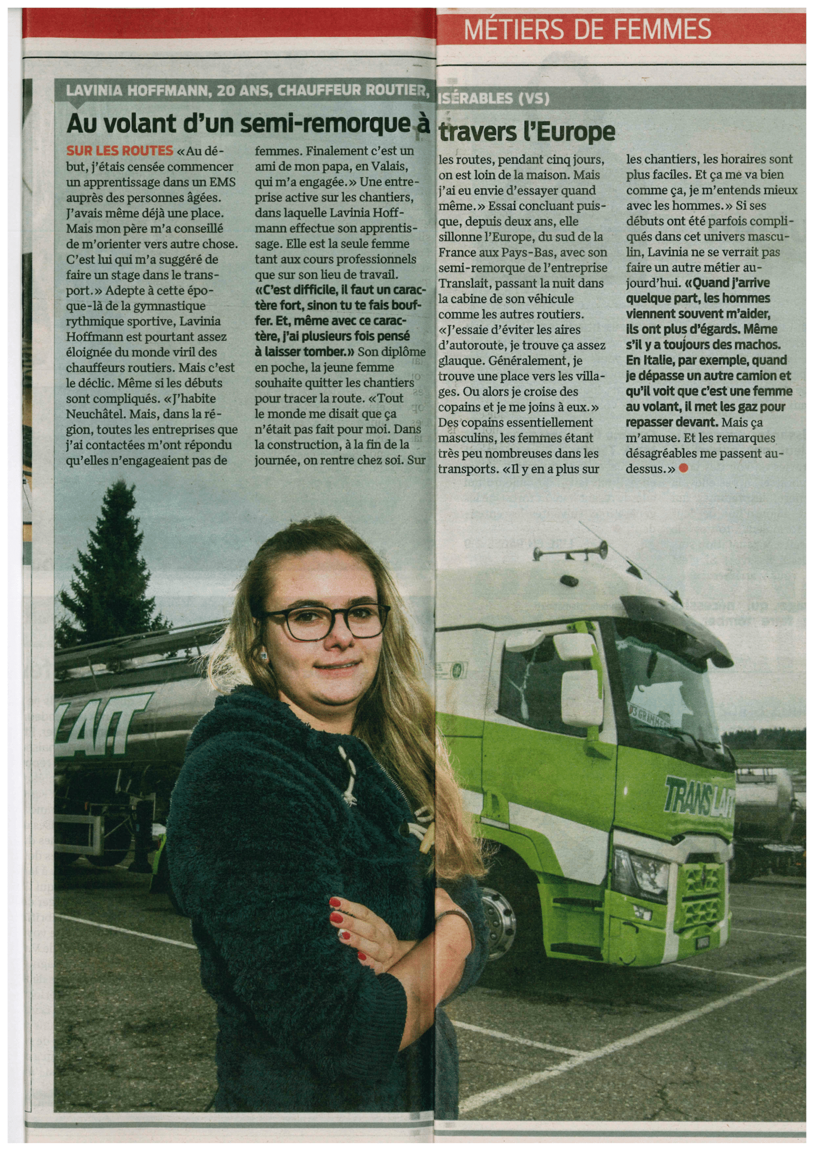 En cette journée internationale des femmes, Translait est fier de compter parmi ses chauffeurs, Lavinia Hoffman. Vous pouvez lire ci-joint un très bel article du journal Le Matin retraçant son expérience "au volant d'un semi-remorque à travers l'Europe".